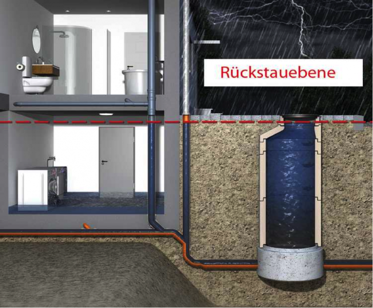Bei einem Sommergewitter oder einer Verstopfung besteht die Gefahr, dass sich Abwasser durch Bodenabläufe und Sanitäranlagen die sich unter der Rückstauebene befinden in Keller und Untergeschosse zurück drückt. Sind diese Räume gegen Rückstau gesichert, dann passiert nichts. Aber wenn nicht, dann werden diese ungesicherten Keller und Räume unfreiwillig zum „Auffangbecken“ und es kommt zu massiven Schäden an der Einrichtung und Bausubstanz.